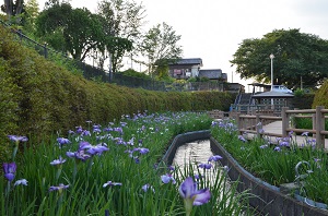 分水堀緑道の菖蒲園では、花菖蒲まつり実行委員会の皆さんが丹精込めて育てた花菖蒲が見頃を迎えています。同じ分水堀緑道のせせらぎの道でもあじさいが咲いており、訪れた人たちの目を楽しませています。