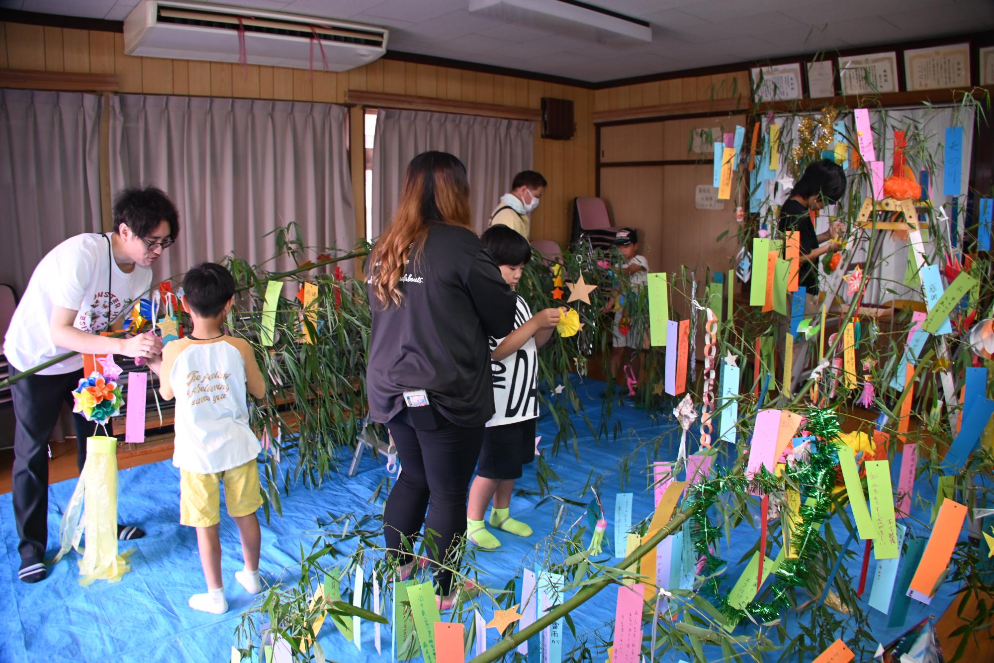 第5区公民館で、「第5区七夕まつり」が行われました。地元の子どもたちやいずみの里・第5区の皆さんは、カラフルな七夕飾りを作り、「家族が全員健康で暮らせますように」などのさまざまな願い事を短冊に託しました。その後完成した七夕飾りの1つは、いずみの里に届けられ、施設の皆さんの目を楽しませていました。また、今回の第5区七夕まつりでは3世代交流を目的として、地元の子どもたちや友和会の皆さんによる歌の披露も行われました。