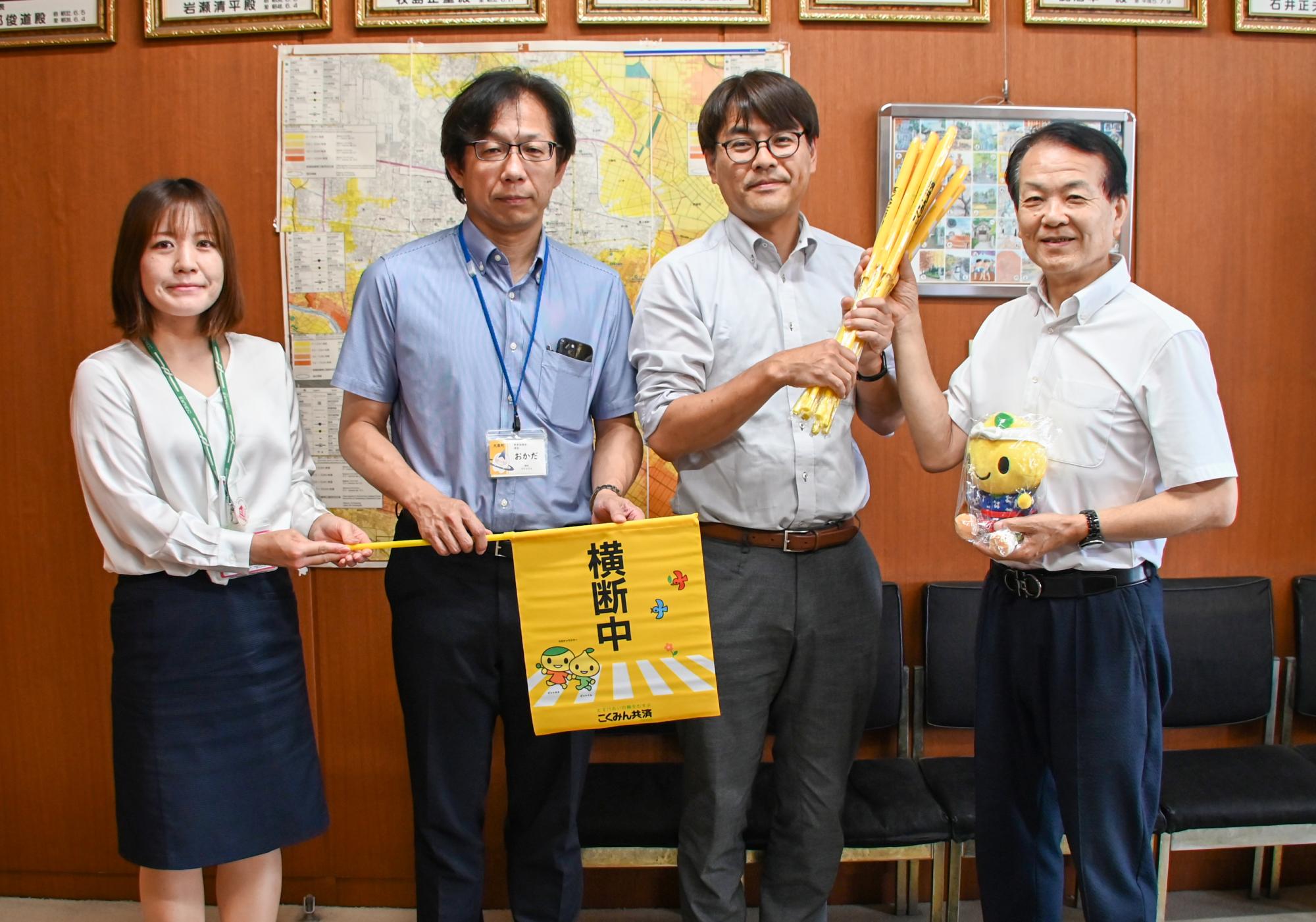 こくみん共済coop〈全労済〉の皆さんが来庁し、7さいの交通安全プロジェクトとして「子どもたちの交通安全に役立ててください」と、町内の小学校に対して計10本の横断旗を寄附していただきました。福田教育長は、「このような遠くから見ても目立つ横断旗があると、小さな子どもたちが横断歩道を渡るときに運転手にも気づいてもらいやすくなるので、とても助かります」と話しました。