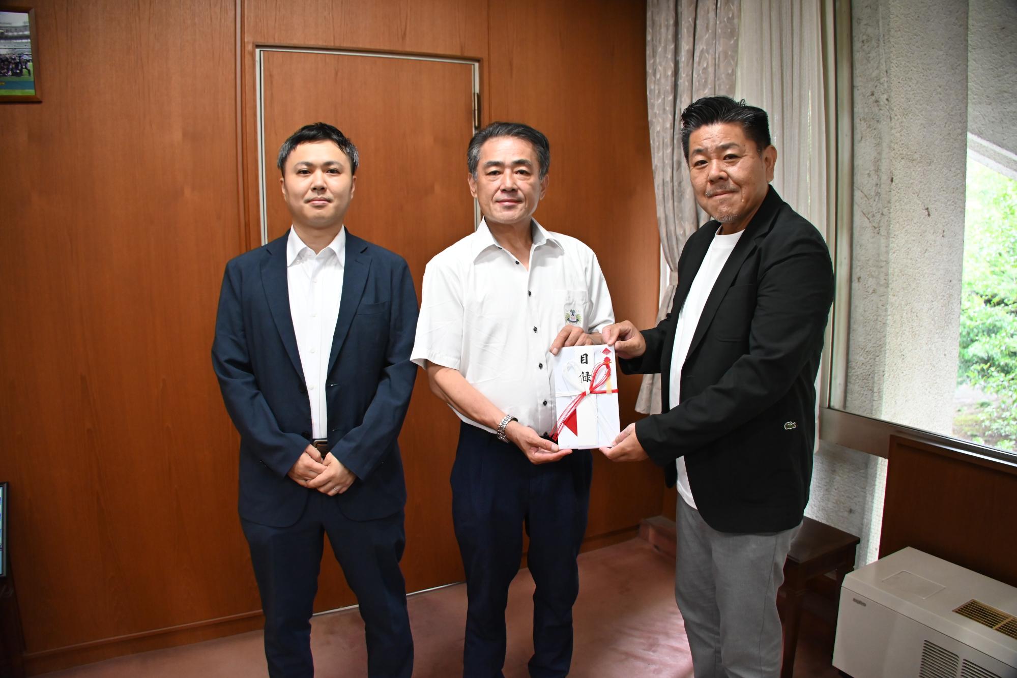 創立55周年を迎えられたプロファ設計株式会社の杉山代表取締役と須佐営業部長が来庁し、町の英語教育推進事業に役立ててくださいと、企業版ふるさと納税として町へ寄附していただきました。
