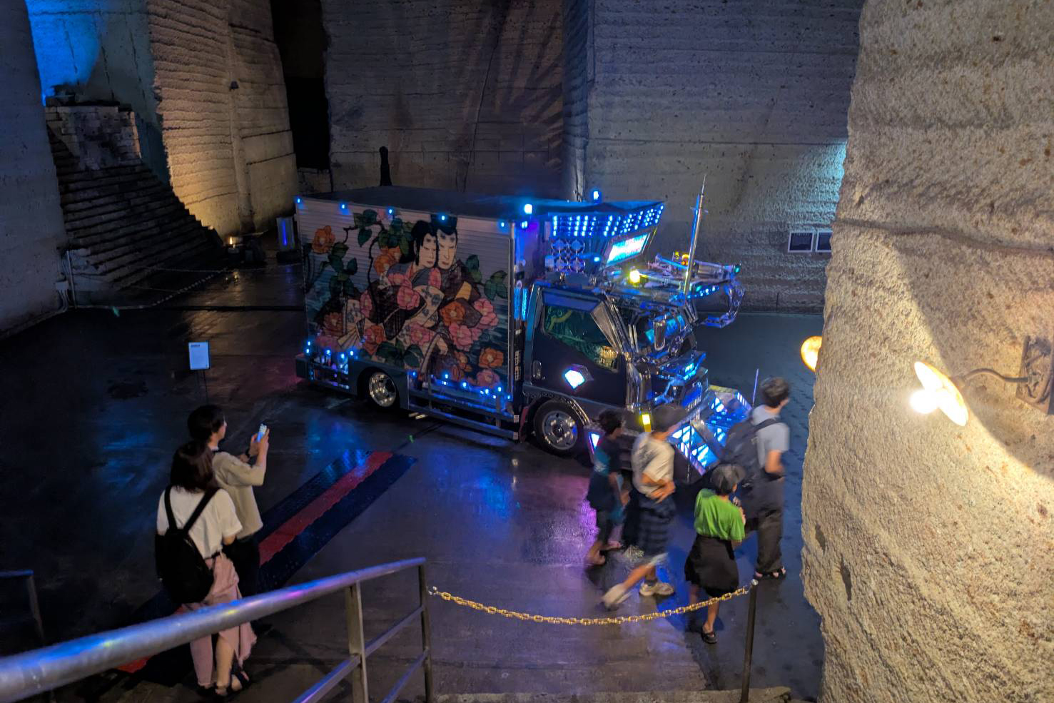 大谷資料館(栃木県宇都宮市)で、町が後援している「デコトラ展」が開催されました。デコトラとは、ド派手な装飾や電飾で彩られた特殊なトラックであるデコレーショントラックのことで、町と災害協定を締結している一般社団法人全国哥麿会のデコトラが展示されました。デコトラと大谷石の地下空間により幻想的な雰囲気が演出された会場には、大迫力のデコトラを一目見ようと多くの人が来場し、じっくりと鑑賞する村山町長の姿も見られました。この展示会は令和7年7月27日(日曜日)まで開催されています。皆さん、ぜひご来場ください。