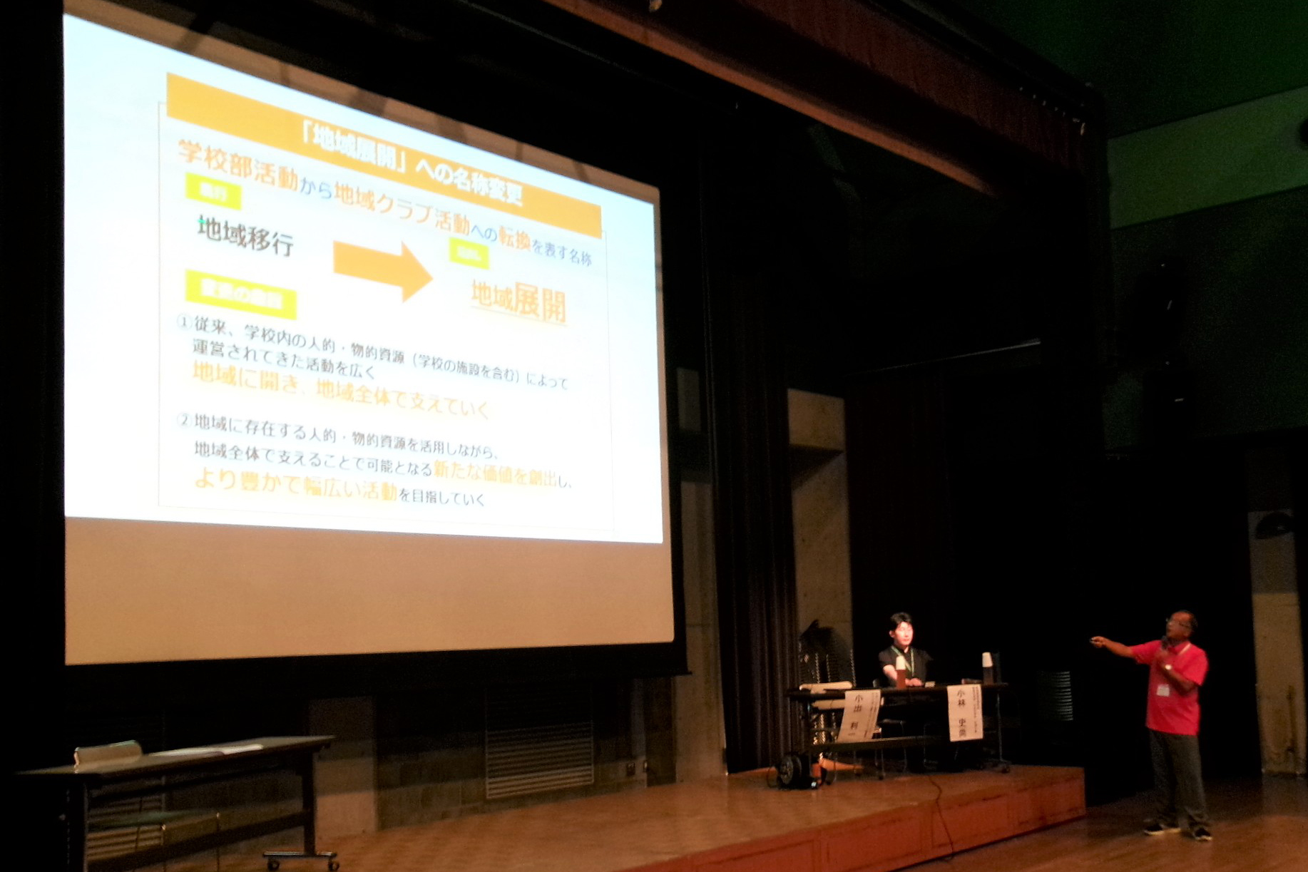 洋泉興業大泉町文化むらで、スポーツ庁地域スポーツクラブ活動アドバイザー・NPO法人新町スポーツクラブ理事長の小出利一さんと群馬県教育委員会健康体育課指導主事の小林史尚さんを講師に招き、令和8年度からの実施に向けた部活動地域展開における、制度の説明や国、県の動向などについての説明会を開催しました。説明会には、各関係者や保護者など約90人が参加し、講師からの説明を熱心に聞き入っていました。参加した人からいただいたご意見などを参考にしながら、今後も町の部活動地域展開に向けて取り組んでいきます。
