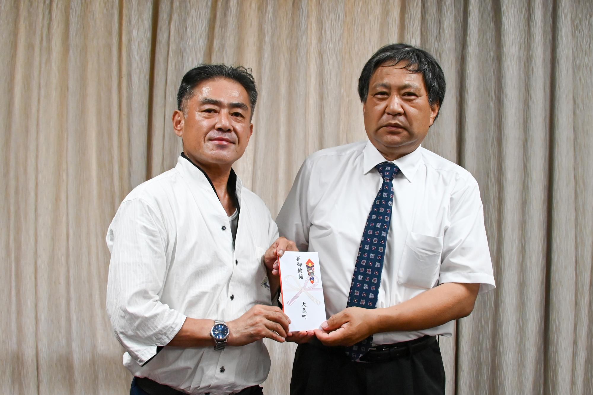 群馬大泉相撲クラブに所属する小学4年生から中学2年生までの9人の選手と指導者などの4人が来庁し、村山町長に今までの大会での成績を報告するとともに、それぞれ出場する予定の関東中学校相撲大会(8月9日)、第40回わんぱく相撲全国大会(8月10日)、第55回全国中学校相撲選手権大会(8月20日・21日)、令和7年度JOCジュニアオリンピックカップ(8月31日)への意気込みを話しました。村山町長からは事業団出場援助金が贈呈され、「将来、大泉町から力士が誕生することを楽しみにしています。これからも一生懸命がんばってください」と激励の言葉が贈られました。