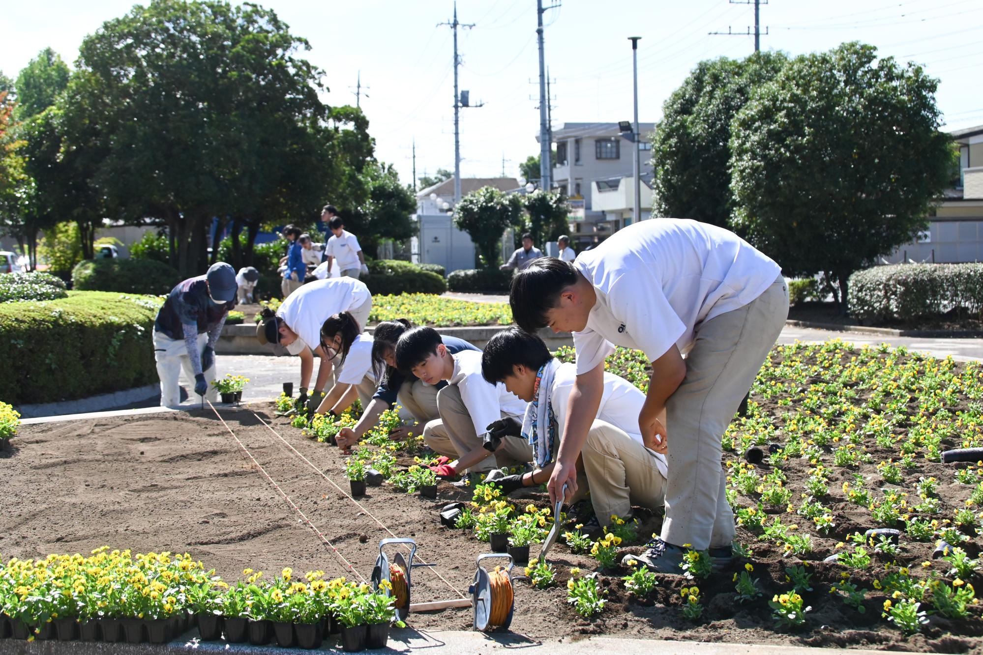 いずみ緑道花の広場の花壇で、県立大泉高等学校生物生産科の2年生36人が約5,000鉢の黄色いビオラを植栽しました。この植え替えは春と秋の年に2回、実習の一環として行っています。先生の指導のもと、生徒たちは苗の間隔を確かめ合いながら、一つひとつ丁寧に苗を植えていました。植栽をした生徒は「2回目の植栽なので、コツをつかんで前回よりもきれいに植えることができました」と話していました。