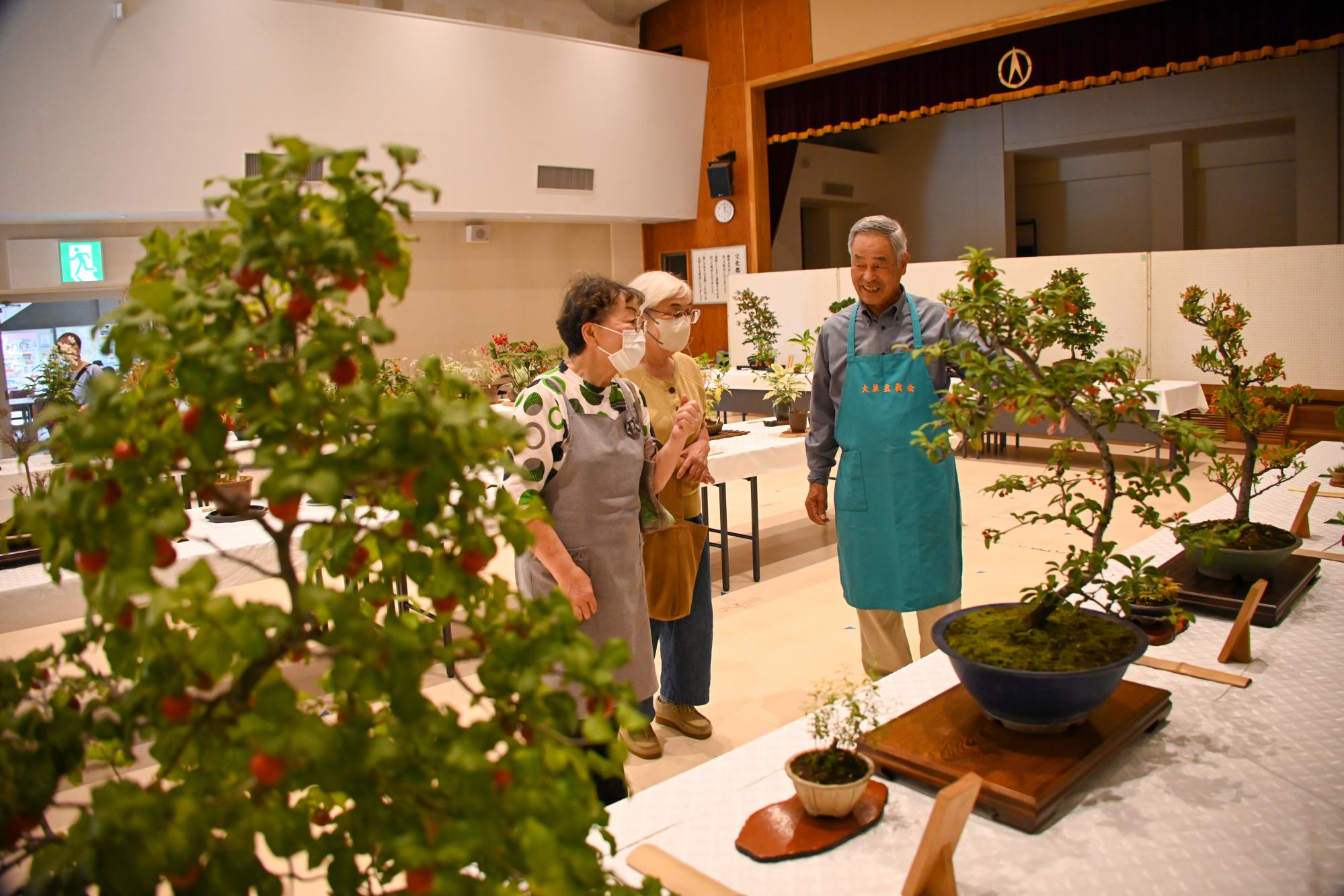 町公民館ホールで「秋の盆栽・山野草展」が開催され、大泉盆栽会会員の皆さんによって丹精込めて育てられた盆栽と山野草、50点が展示されました。来場した皆さんは立派に育った松や柿などの盆栽や、かわいらしい花を付けた山野草をじっくりと鑑賞していました。鑑賞していた人からは「展示されている盆栽と山野草がどれもすばらしくて、来て良かったです」という声があがり、実際に山野草を育てているという人は「発想がすごいです。自分もがんばって育てようと思いました」と話していました。また、10月19日には村山町長も会場を訪れ、盆栽や山野草を一つひとつ鑑賞していました。