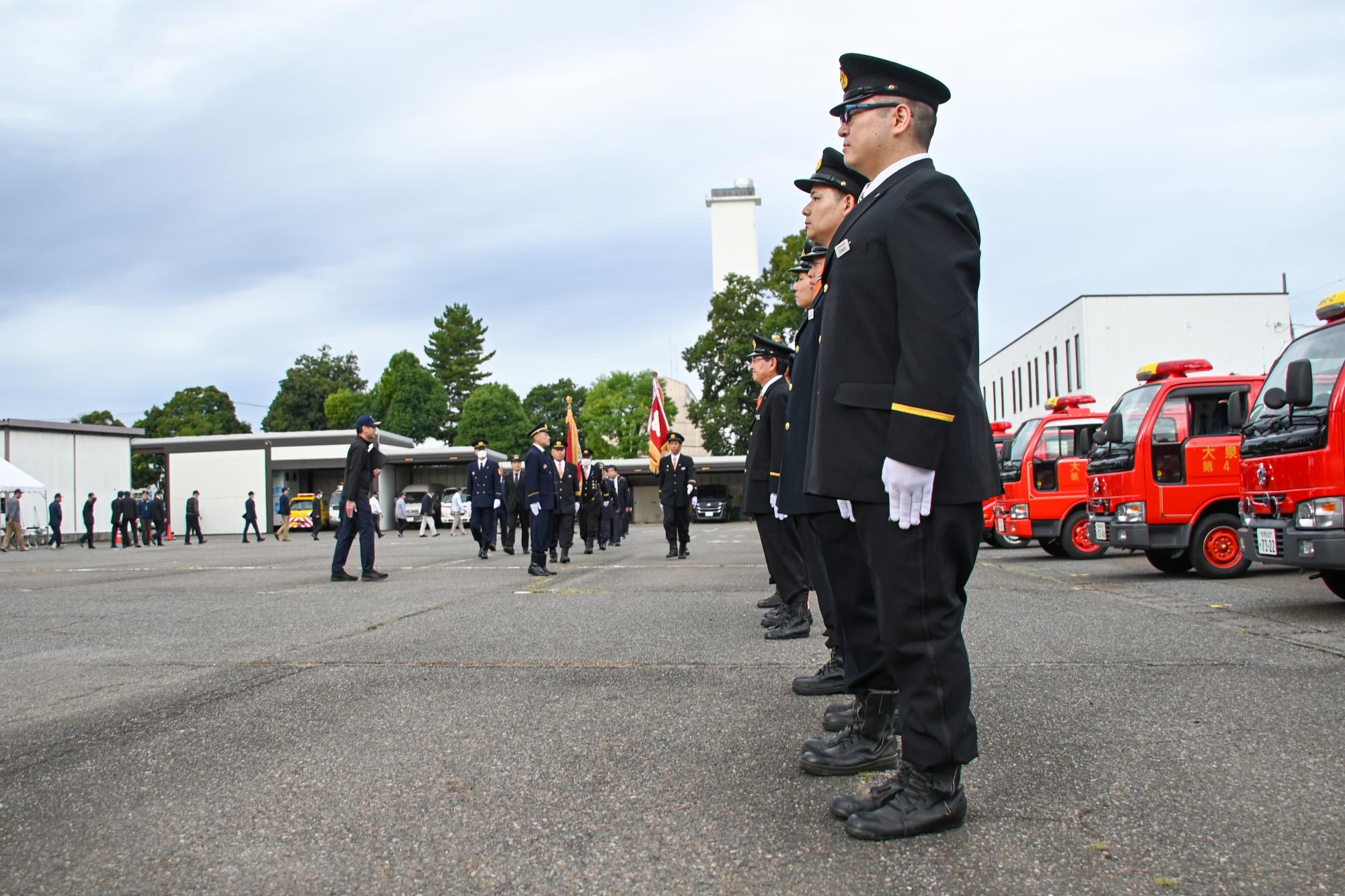 大泉町役場北側職員駐車場で「令和7年度大泉町消防団秋季点検」が行われました。村山町長は点検者として、機械器具や姿勢服装の点検を行いました。また、消防団員は部隊訓練や放水訓練を行い、日ごろの訓練の成果を披露しました。