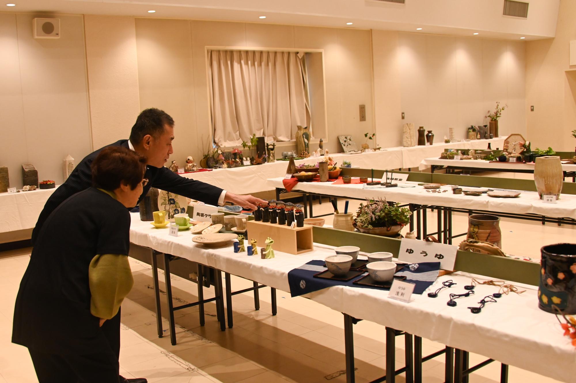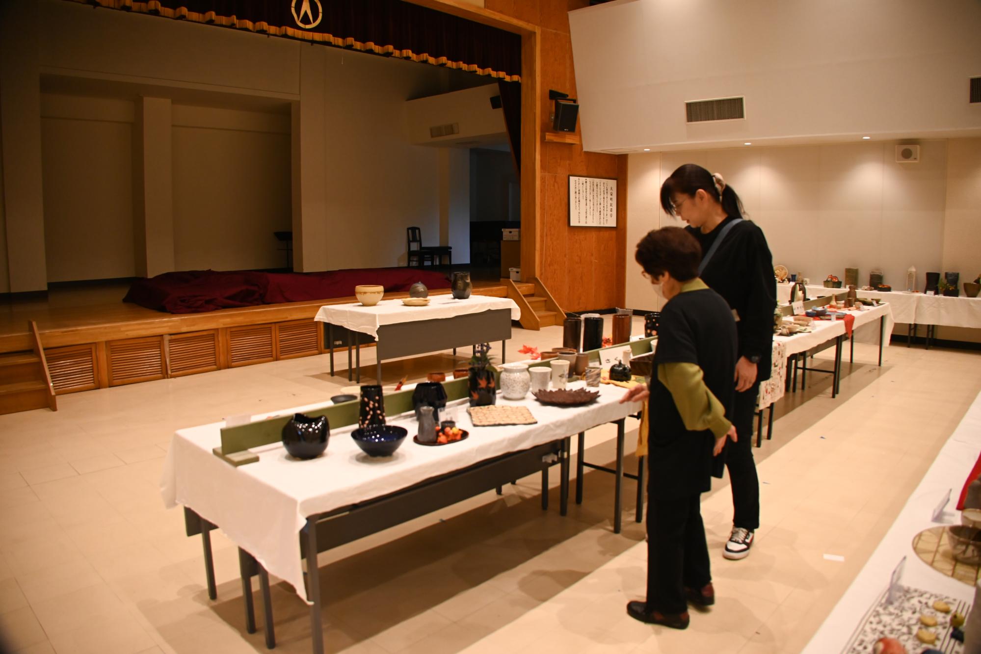 町公民館ホールで町公民館陶芸協議会主催の「陶芸展」が開催されました。会場では、町公民館陶芸協議会会員による陶芸作品の展示や販売のほか、町内保育園年長児や町公民館主催の陶芸体験教室参加者の作品が展示されました。会場には村山町長も訪れ、会員や来場者から感想などを聞きながら、個性あふれる作品を一つひとつ熱心に鑑賞していました。
