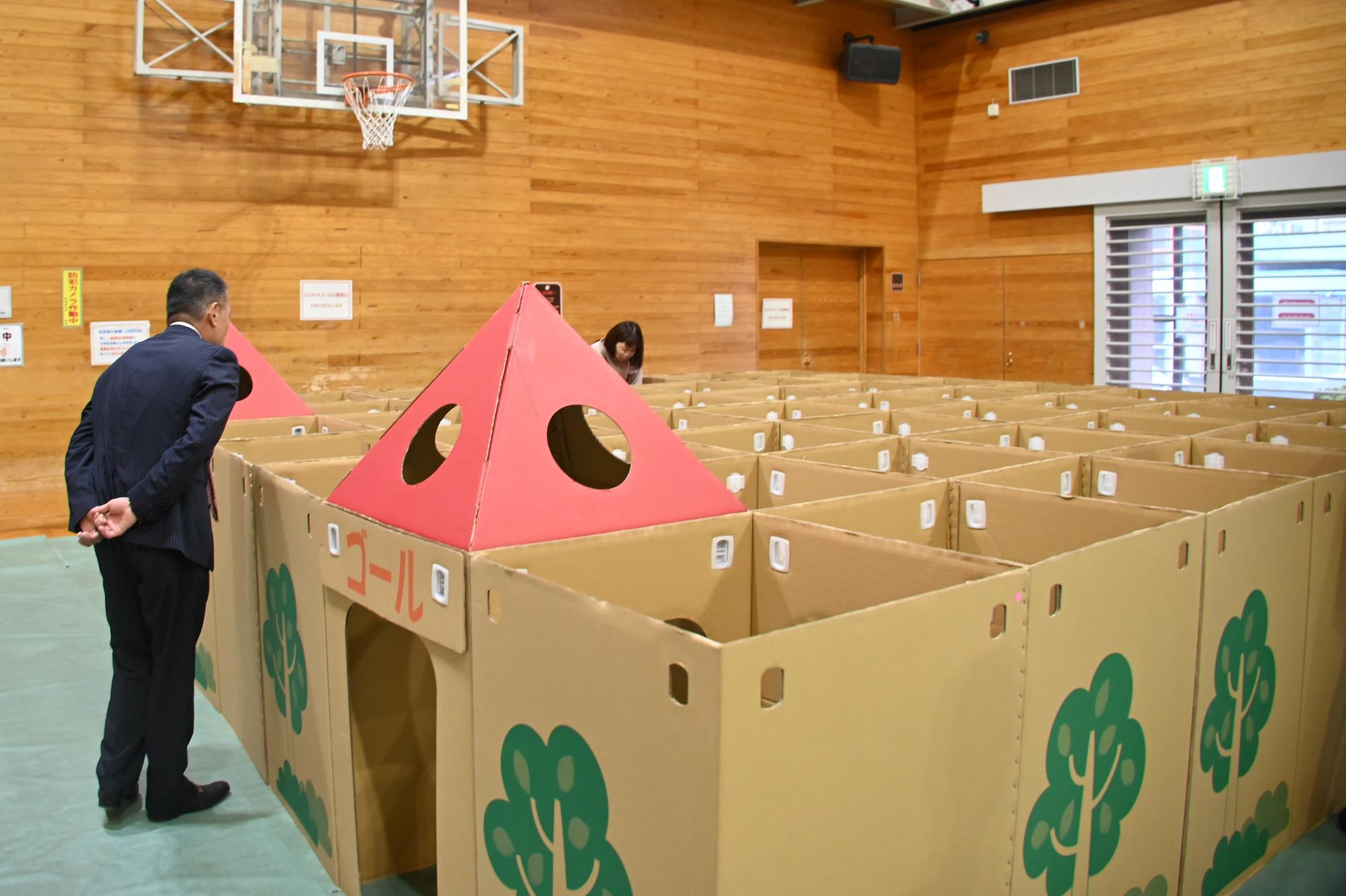 洋泉興業大泉町文化むら展示ホールで「令和7年度夜間の避難所開設訓練」が開催されました。この訓練は、災害により停電が発生した夜間においても、避難所開設を円滑かつ適切に行えるよう実施したもので、自主防災組織関係者、防災士、町職員など109人が参加しました。参加者は、避難者の受付の仕方やLEDバルーン照明のつけ方などを学ぶ「避難所の初動対応訓練」のほか、災害協定を締結している洋泉興業株式会社(ワカキヤフードサービス)様から調達した食材で実施した「炊き出しの試食」、避難所でのペットの受け入れ方を学ぶ「ペット同行訓練」などを体験しました。「備品の組立・稼働訓練」を体験した参加者の一人は「災害はいつ起こるかわからないので、この機会に皆さんと協力してパーティションの組み立て方法などを学ぶことができて勉強になりました」と話していました。