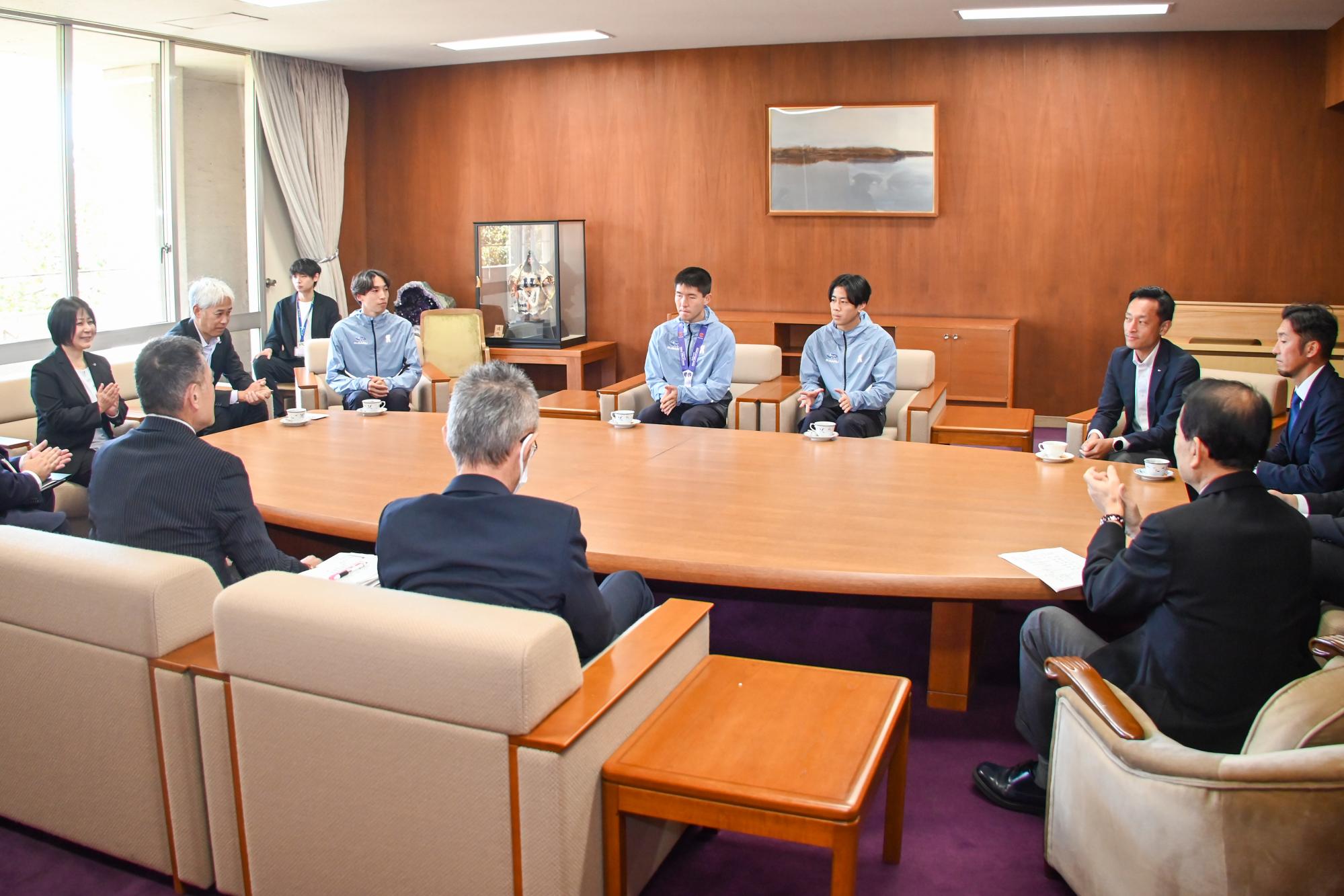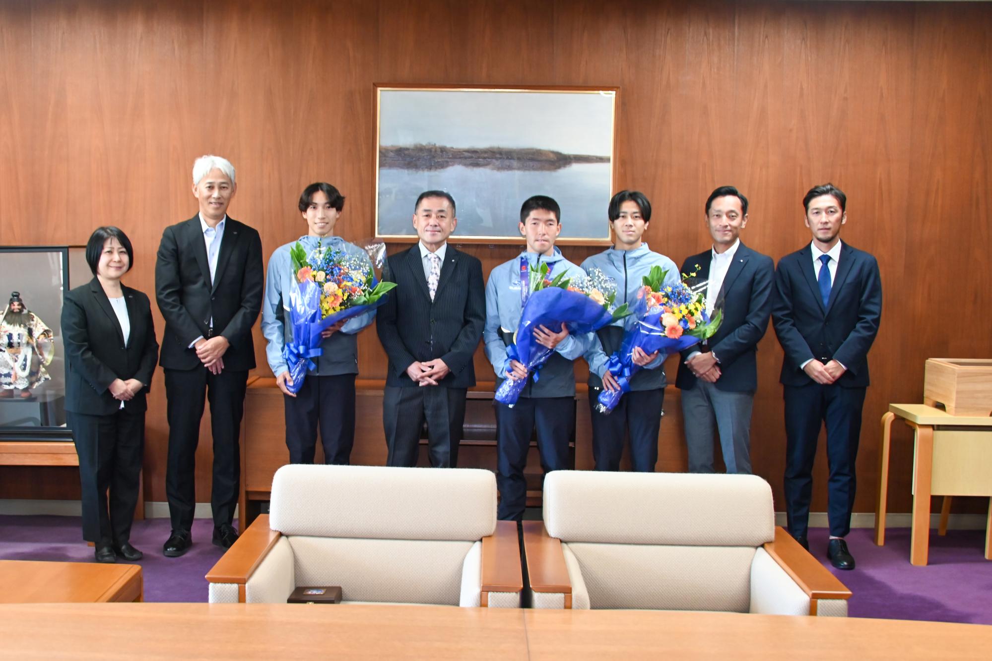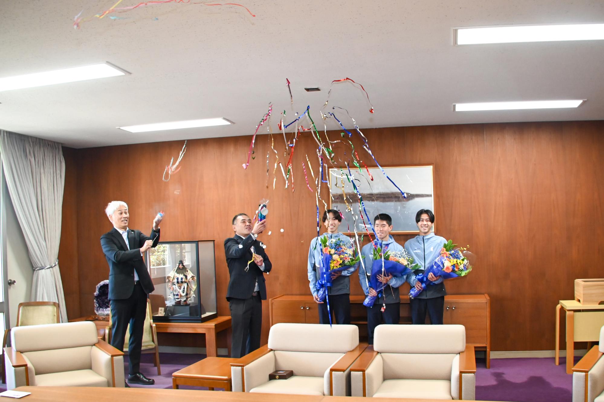 SUBARU陸上競技部に所属する三浦龍司選手、唐澤剣也選手、唐澤選手のガイドランナーを務める堀越翔人さんが、今シーズンの成績を報告するため、村山町長を表敬訪問しました。三浦選手は「9月に開催された国際大会ではメダル獲得を目標としていましたが、8位入賞という悔しい結果となりました。次回はメダルを取り、唐澤選手といっしょにメダルを持って報告に来られるようにがんばりたいです」と今後の目標について語られました。また、唐澤選手は「たくさんのサポートをしてくれたチームスタッフのおかげで、日頃の練習の成果を発揮して昨年の銀メダルを上回り金メダルを取ることができました」と話し、堀越さんは「唐澤選手が良い状態で走ってくれたことで、自分自身も楽しみながら走ることができ、貴重な経験になりました」と喜びを口にしていました。村山町長からは激励⾦と花束が贈呈され、クラッカーを鳴らし祝福され、「地元企業から世界的な大会でメダルを獲得する選手が生まれたことをとてもうれしく思います。これからもがんばってください。期待しています」という激励の言葉が送られました。