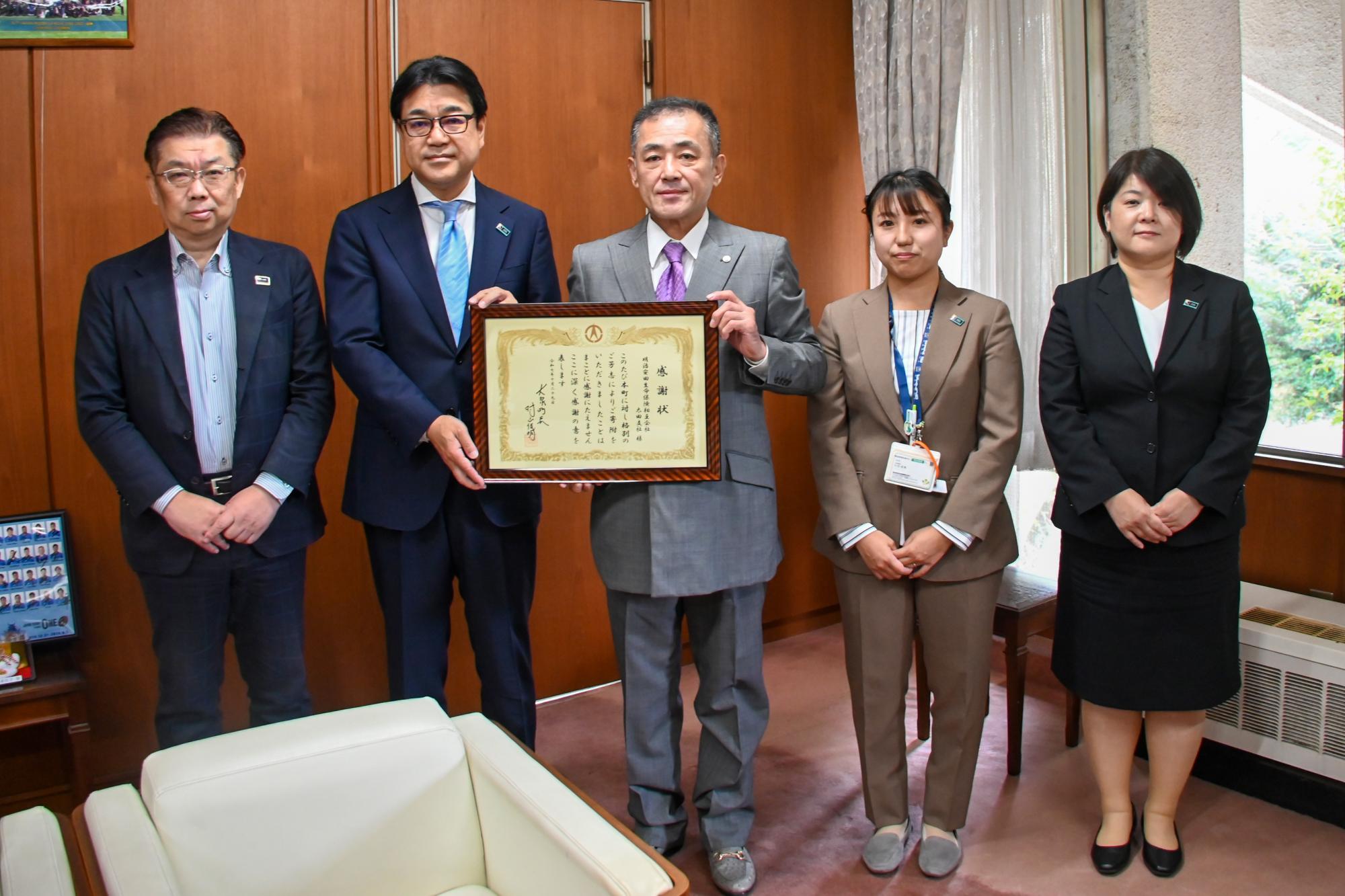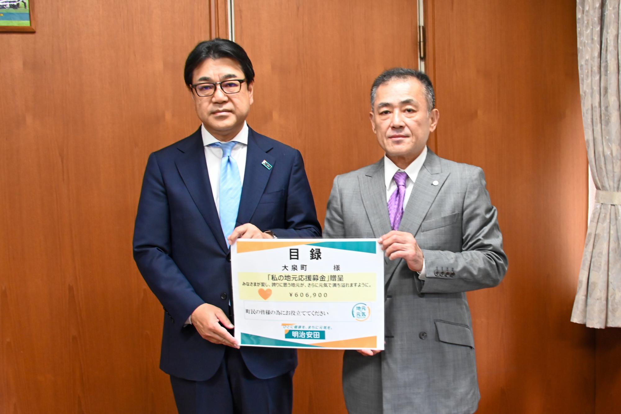 町と包括連携協定を締結している明治安田生命保険相互会社太田支社の皆さんが来庁し、「私の地元応援募金(従業員募金と会社拠出寄附をマッチングした寄附)」として町のためにお役立てくださいと60万6,900円を町に寄附していただきました。村山町長からは「皆さまには、協定を締結していただいたり、ご寄附いただいたりと、いつもありがとうございます」とのお礼の言葉とともに、感謝状が贈呈されました。