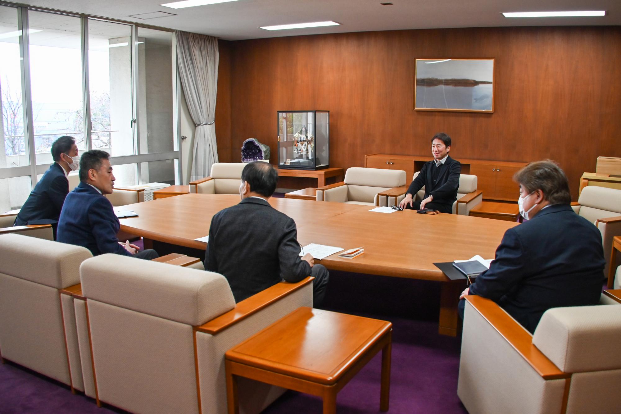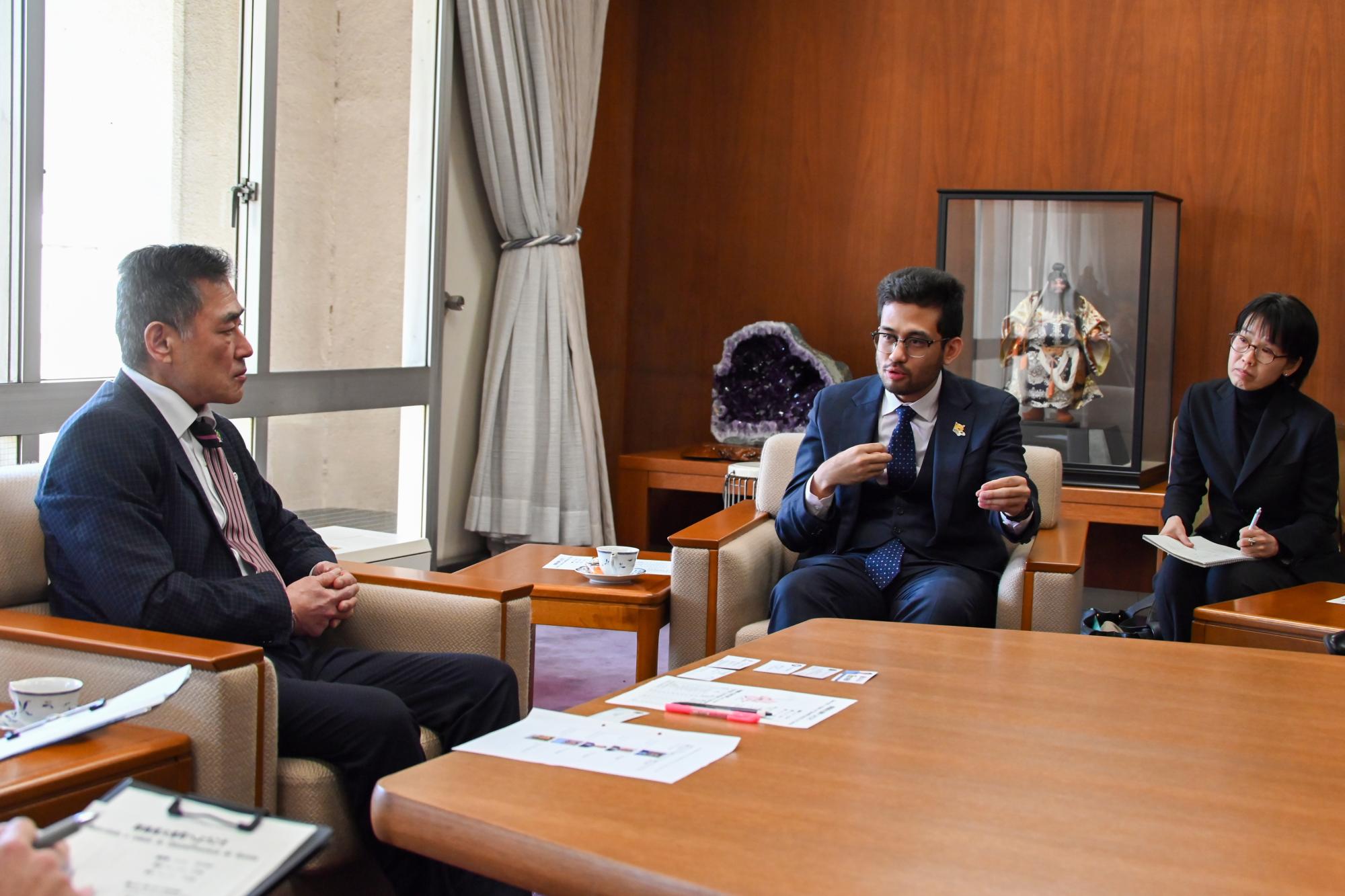 町内でブラジリアン柔術ジム「UNITED FIGHTERS ACADEMY」を経営するナカムラ・マルコスさん、ジムの指導者シルバ・ケンボリさん、シルバ・ケンボリさんの妻カタギリ・パトリシアさんが来庁され、ボランティアとして町の防犯や清掃活動、不登校の子どもたちへの悩み相談など、地域の課題解決に向けた協力についてお話をいただき、村山町長と意見交換を行いました。