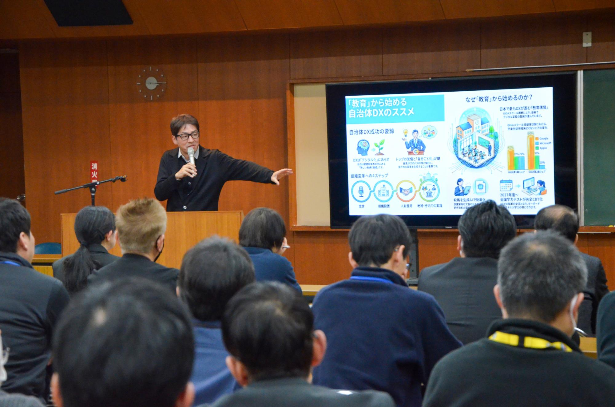 「大泉町未来共創フェロー」に委嘱された陳内裕樹さんと小出泰久さんの委嘱状交付式が行われ、村山町長から陳内さんに委嘱状が交付されました。なお、小出さんは当日欠席となりましたので、委嘱状は後日、交付させていただきました。交付式後には、今後のまちづくりに向けて陳内さんが村山町長や福田教育長と意見交換を行いました。さらに、陳内さんによる管理職員向けのDXに関する研修会も開催され、多くの職員が参加しました。未来共創フェローの委嘱は群馬県内で初めての取り組みです。お二人には町の諸課題や教育課題の解決に向けて、DX(デジタル・トランスフォーメーション)についての知識や全国の自治体でのアドバイザー経験に基づいた助言や支援をいただきます。