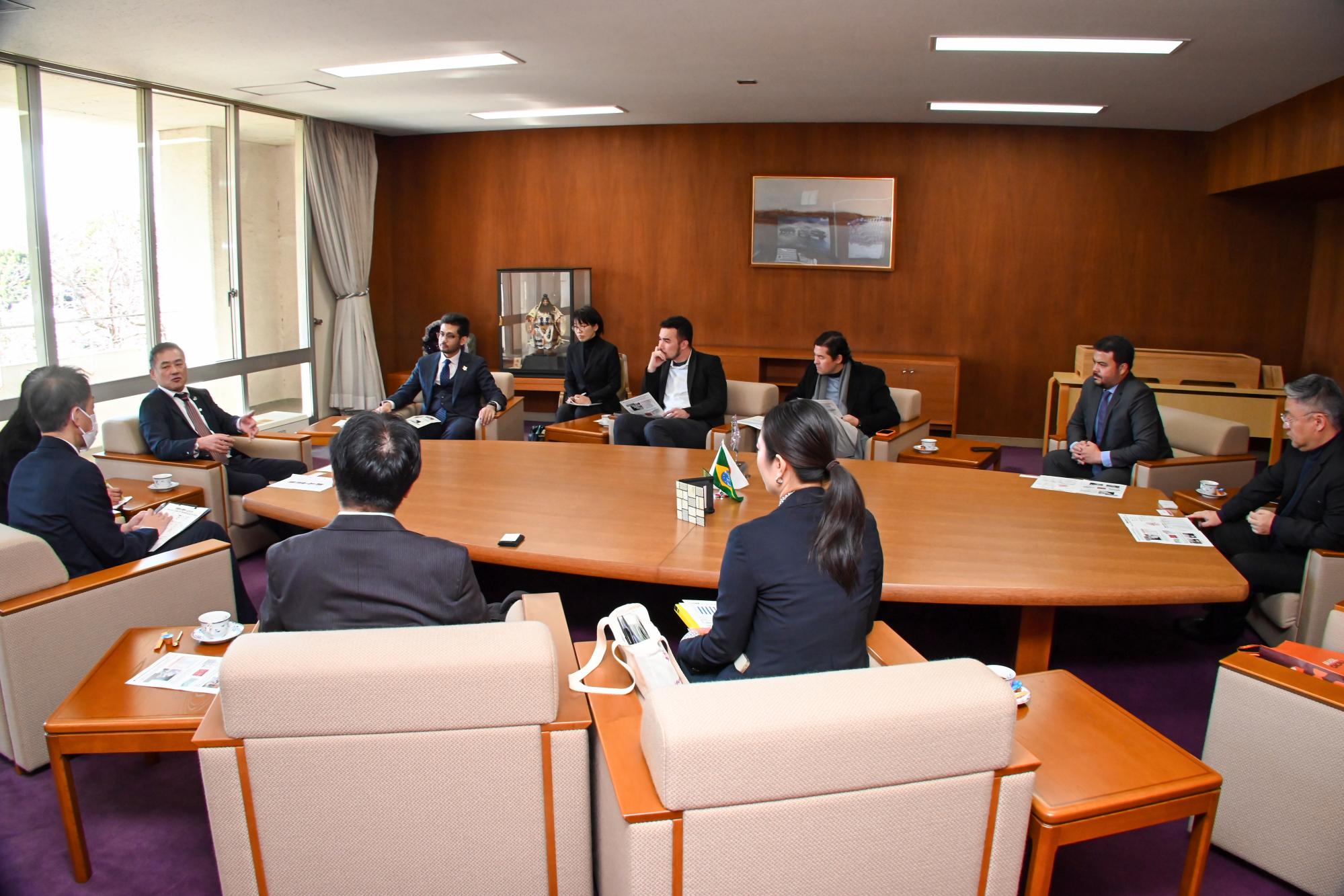 公益財団法人笹川平和財団のプログラムの一環として、ブラジルの連邦下院議員やサンパウロ市議会議員など若手日系ブラジル政治家5人が、村山町長を表敬訪問しました。公益財団法人笹川平和財団は、世界の平和と安定に向け、さまざまな国や地域と国際交流・協力を行っている民間財団で、日系人が多く居住する町として知られる本町が実践している多文化共生の取り組みなどに関心を寄せて来町されました。村山町長は、国籍を問わずお互いを尊重できるまちづくりへの思いを皆さんにお伝えし、活発な意見交換を行いました。