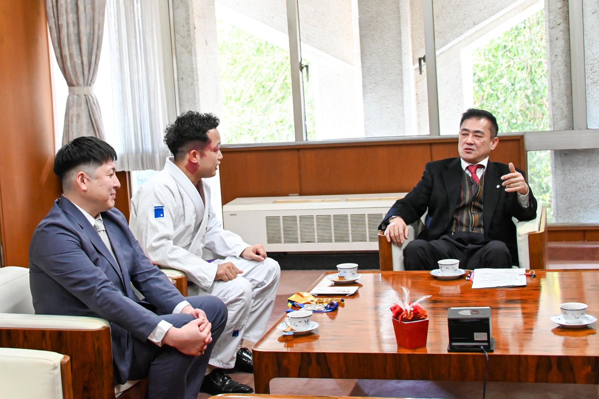 ブラジリアン柔術「インファイト・ジャパン」のアダルト青帯ミディアムヘビー級で活躍する町内出身で在住の冨岡聡さんと、冨岡さんのスポンサーを務めるはた接骨院院長の波田有純さんが、3月に開催される大会に向けて村山町長を表敬訪問しました。冨岡さんは、救急救命士として働きながらブラジリアン柔術で世界に通用する選手になることを目標として日々練習に励んでいます。そんな冨岡さんについて波田さんは、「真面目かつ誠実で、忙しい中でも努力を惜しまず、応援したくなるような人柄が魅力的な選手です」と冨岡さんへの印象を語りました。また、村山町長からは「けがに気をつけながら、金メダルを目指してがんばってください」と激励の言葉とともに壮行金が贈呈され、冨岡さんは「結果で期待に応えられるようにがんばりたいです」と大会への意欲を見せていました。