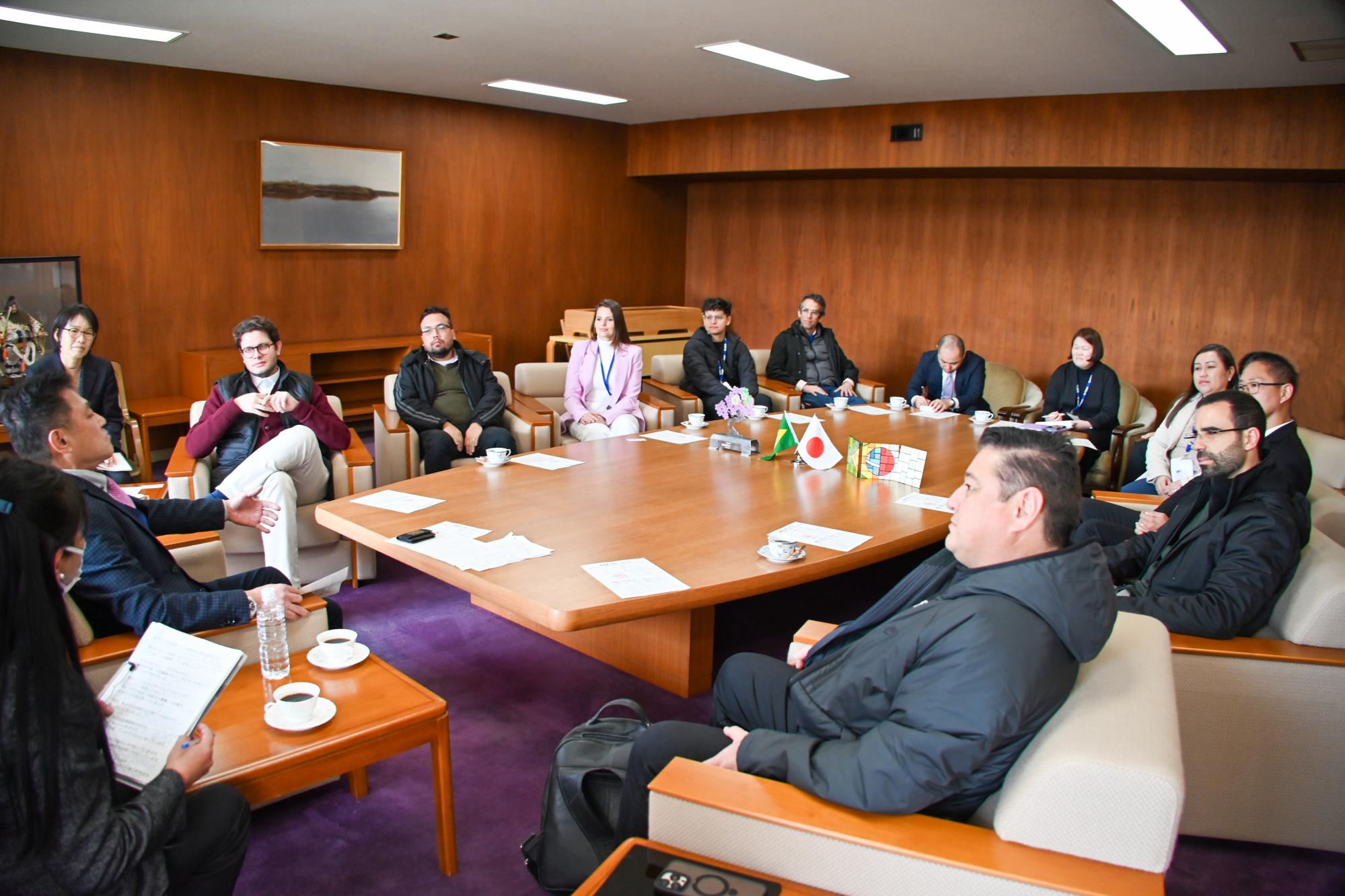 外務省が行う人的交流プログラムの一環で、ブラジルよりサンパウロ州議会議員、マト・グロッソ・ド・スル州工業連盟国際関係部長など、11人が来庁し村山町長と意見交換を行いました。このプログラムは、中南米各国で、さまざまな分野において日本との関係強化に貢献することが期待される若者を日本に招き、日本に対する理解と関心を深めてもらうとともに、親日派・知日派の発掘・育成を図り、日本の魅力を発信してもらうことを目的として行われています。村山町長が本町に暮らすブラジル国籍の皆さんの生活状況や、多文化共生に向けた町の取り組みについて説明すると、来庁された皆さんは熱心に耳を傾けていました。