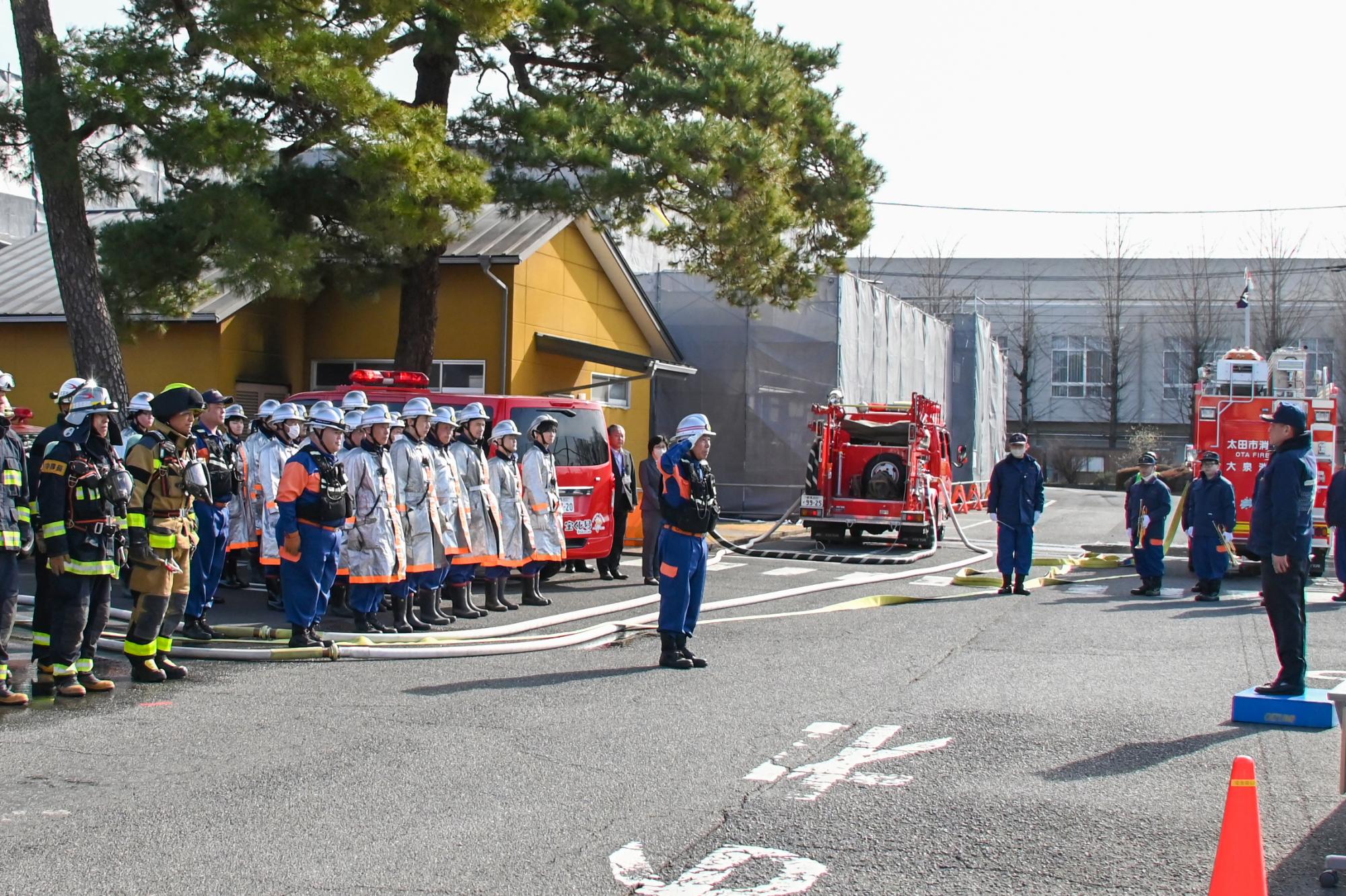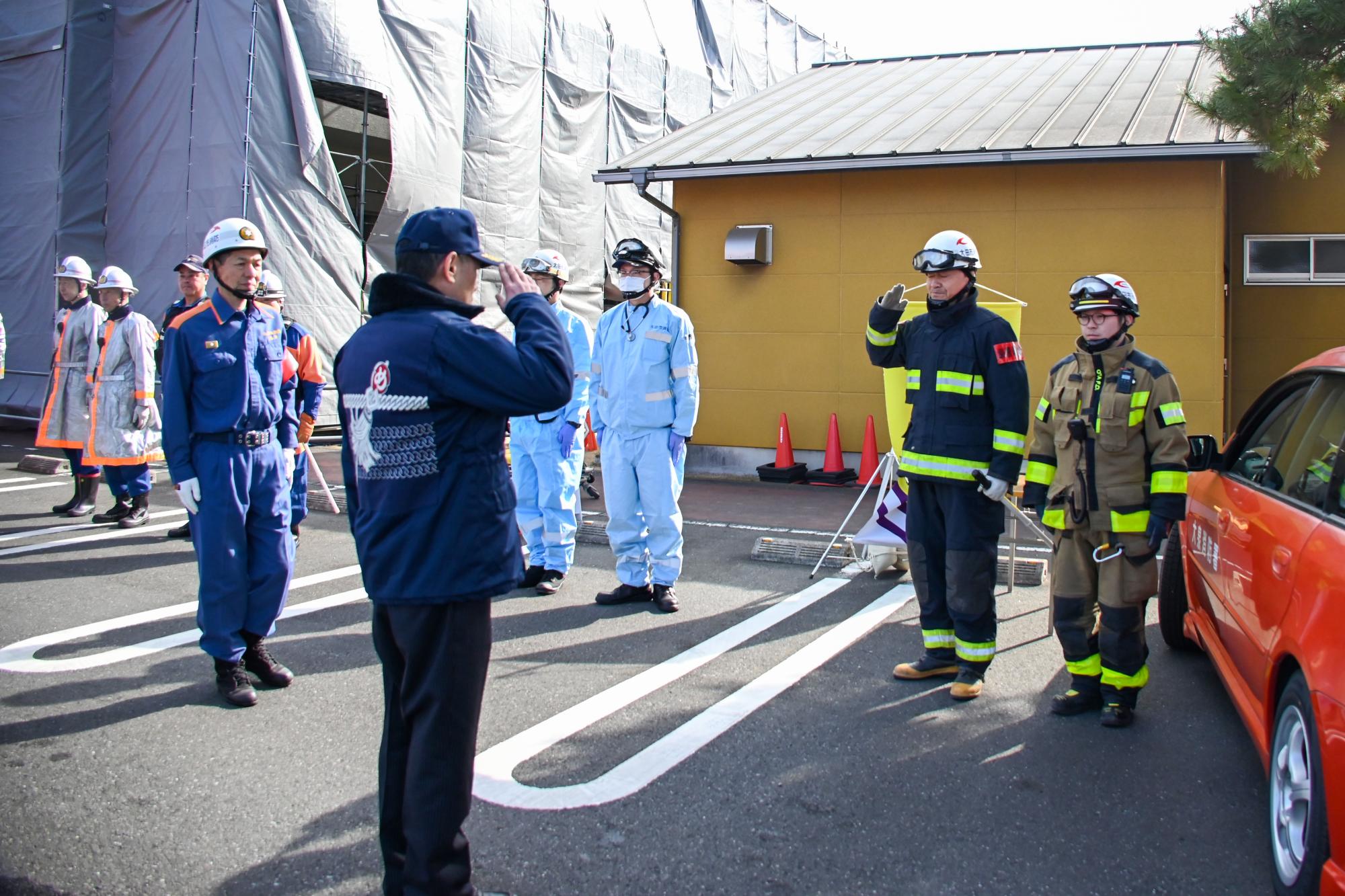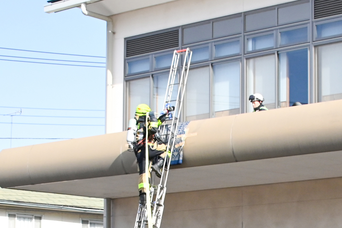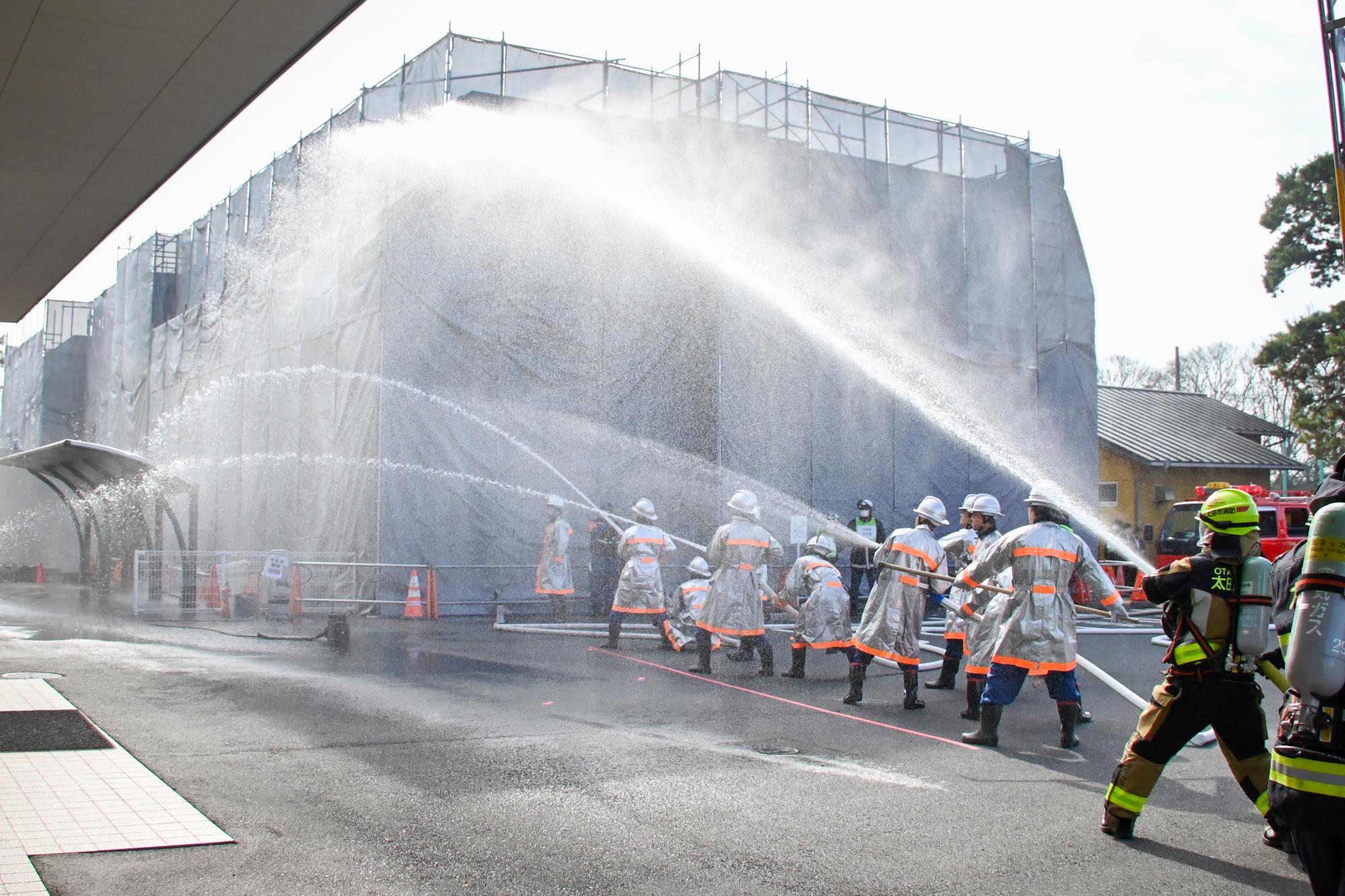 保健福祉総合センターで「大泉町模擬火災訓練」が行われました。今回の訓練では、1階給湯室からの火災発生を想定し、119番通報や初期消火、非常放送設備を使用しての館内放送、避難誘導などの初動対応を確認しました。その後、大泉消防署や大泉町消防団各車両が訓練出動し、はしごで高所にいる要救助者を救助する訓練や消防隊による一斉放水を行いました。訓練統監である村山町長は講評の中で、「消防署と消防団の連携がとれたスムーズな消火活動が行われ、大変頼もしく感じました」と話しました。