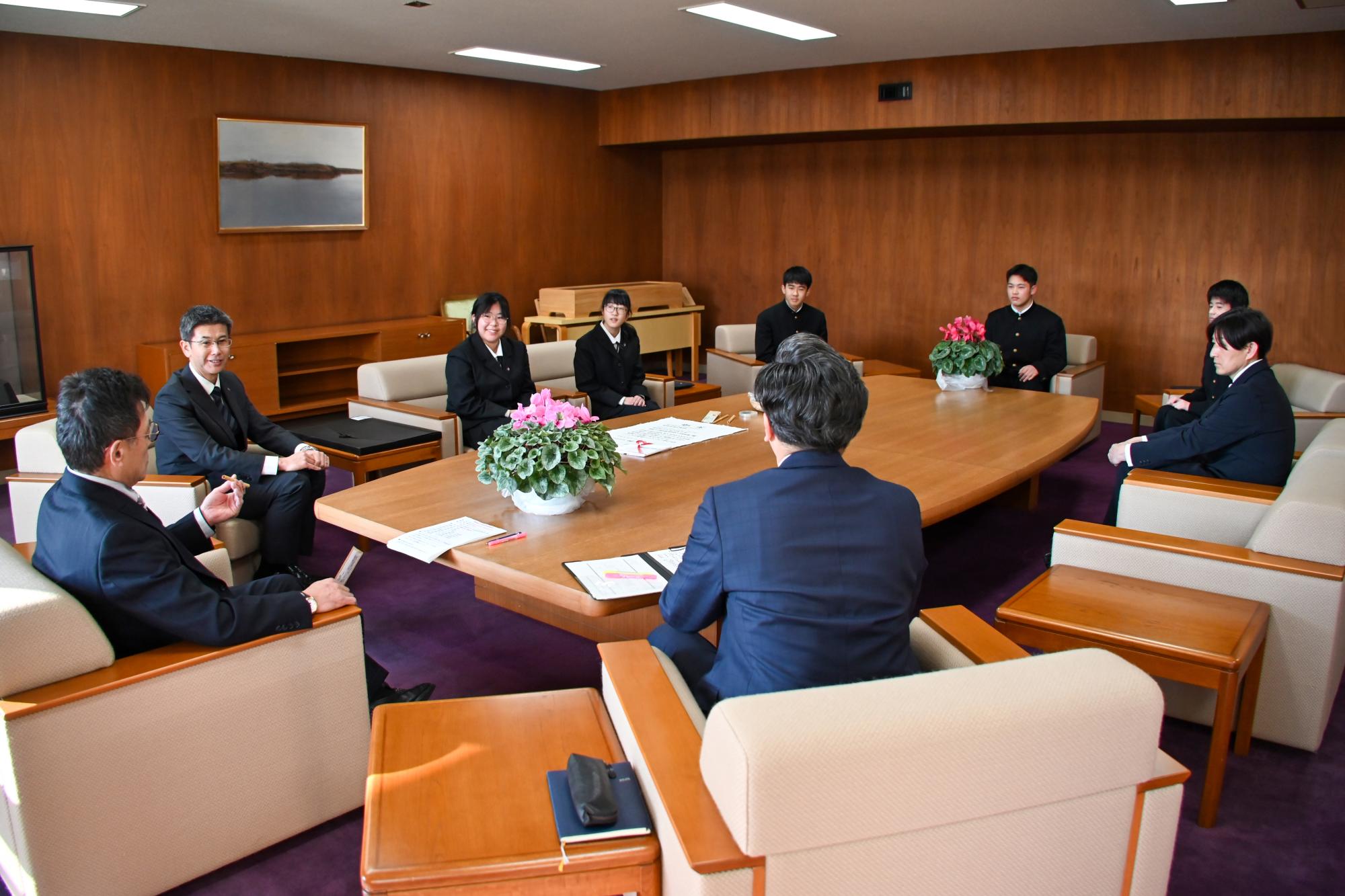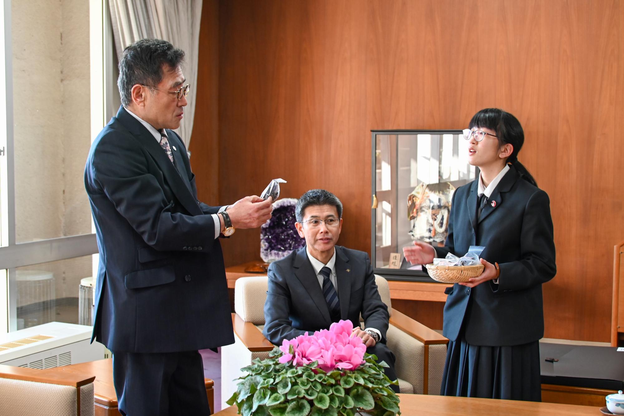 県立大泉高等学校の植物バイオ研究部と微生物バイオ研究部の皆さんが、高校生の環境保全や社会貢献の取り組みを表彰する「第14回イオン エコワングランプリ」の普及・啓発部門で内閣総理大臣賞を受賞し、村山町長を表敬訪問しました。「日本遺産「里沼」の保全活動 地域に愛される湿原を目指して」と題して発表した、茂林寺沼に生えるヨシを活用した「ヨシストロー」の開発や、ヨシを菌床にしたキクラゲ栽培などの取り組みが高く評価されました。今後の活動について、2年生の本島さんは「茂林寺沼の保全活動に、地域の人にもっと参加してもらえるように、今までとは違う新しい活動にも取り組んでいきたいです」と抱負を話し、村山町長からは「今後の活動に期待しています」と激励の言葉が贈られました。