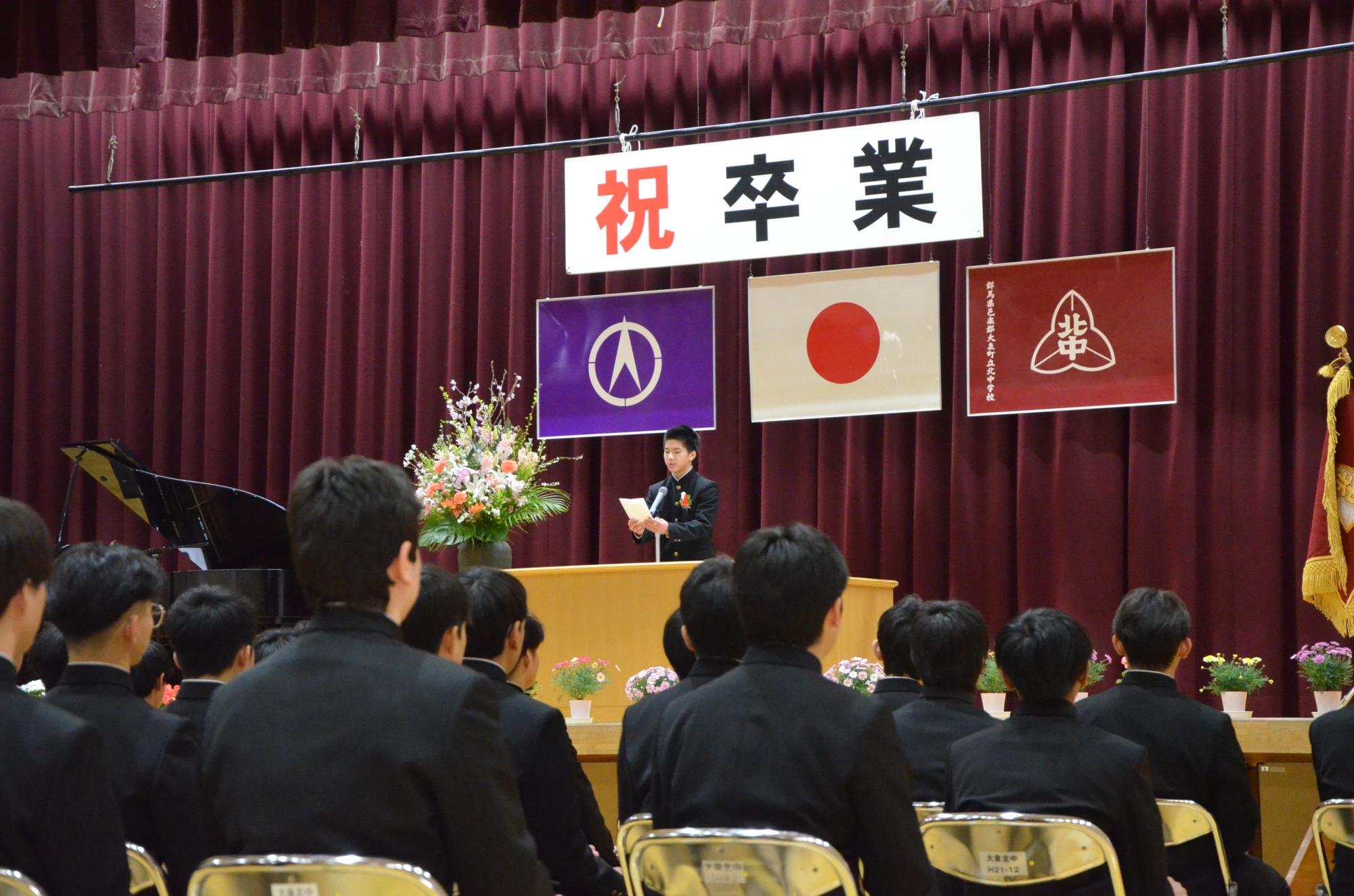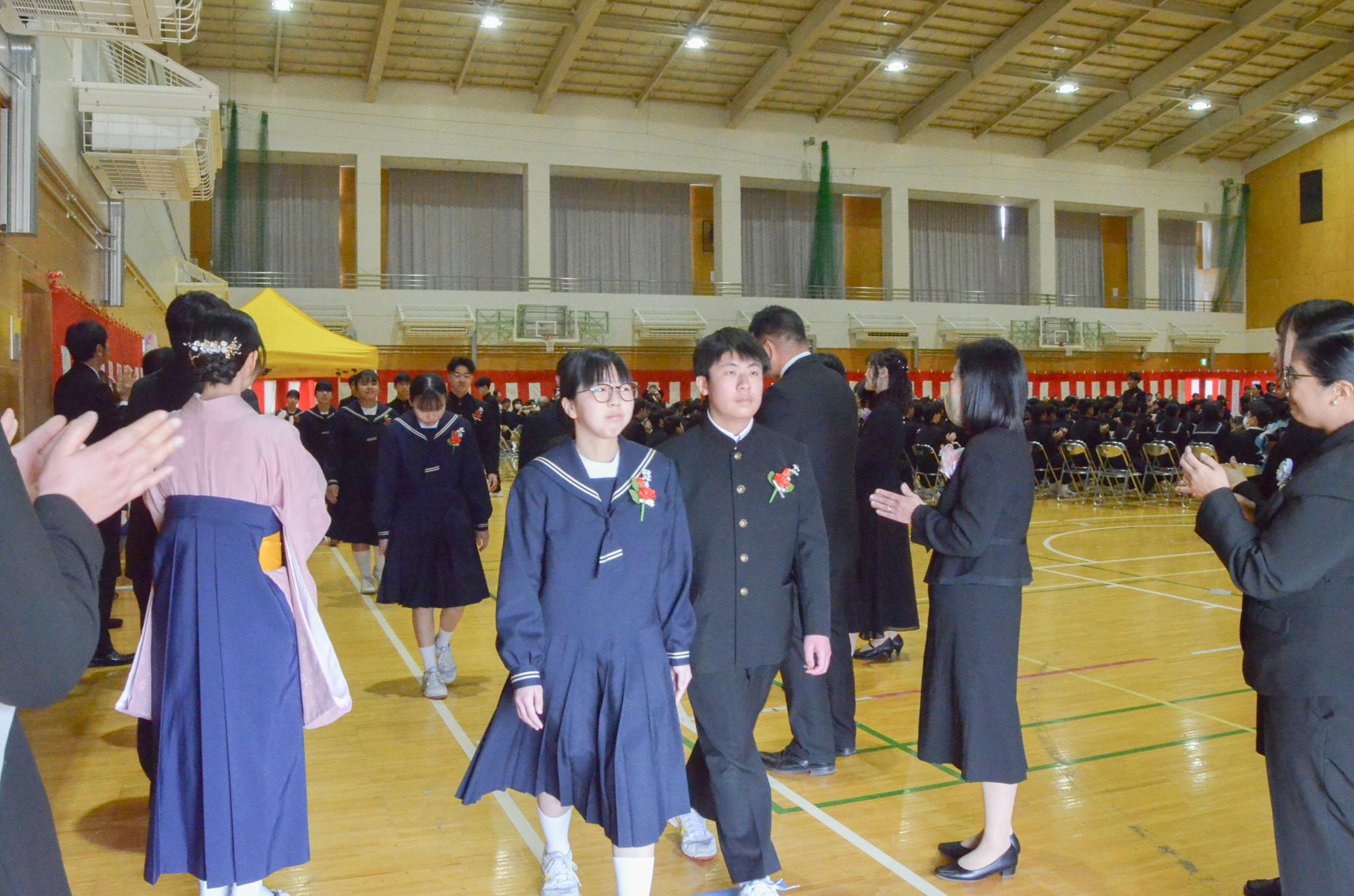 町内の各中学校で卒業式が挙行され、保護者や在校生などに見守られながら、合計346人の卒業生が厳粛な雰囲気の中、一人ひとり卒業証書を受け取りました。式の後には、3年間学校生活をともに過ごした同級生や先生たちとの別れを惜しむ姿も見られました。(写真は町立北中学校です)