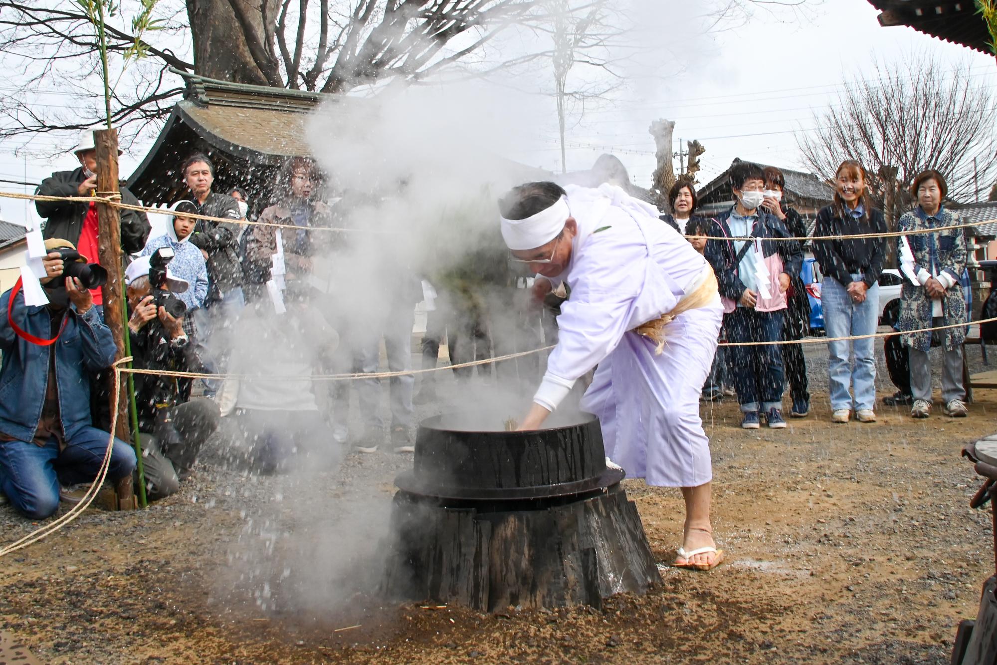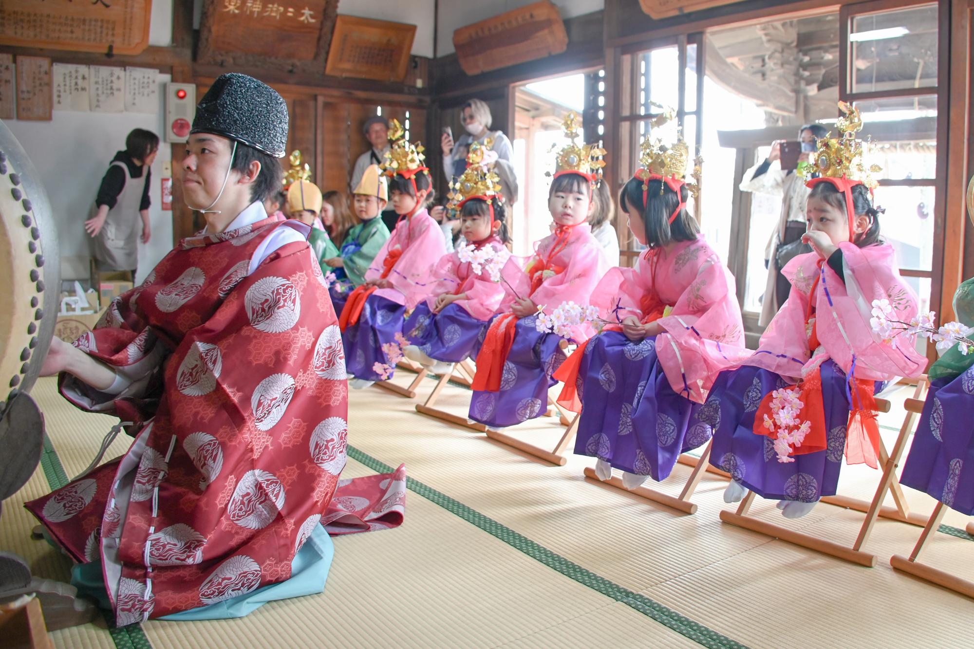 社日稲荷神社で「春の社日大祭」が開催されました。今年は3年に1度行われる「稚児行列」も行われ、緑やピンクの鮮やかな衣装を身にまとった子どもたちが、おしろいや紅でお化粧をしたかわいらしい姿を披露しました。保護者に手を引かれながら神社の参道などを練り歩く姿に、見守る人々からは温かいまなざしが注がれました。午後からは、町指定重要無形文化財である探湯神事が行われ、終了後には、神事で使われた厄難除けの笹や安産御守の麻が配られました。
